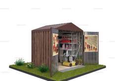 - Выбор архитектурных и дизайнерских решений. Хозблок-дровница может иметь плоскую, одно- или двускатную крышу, окна, вентиляцию, систему водостока. Профилированные листы, выполняющие роль стен, имеют широкий спектр окраски полимерным составом. Помимо чисто эстетической функции он несет еще и практическую нагрузку – защищает металл от коррозии.